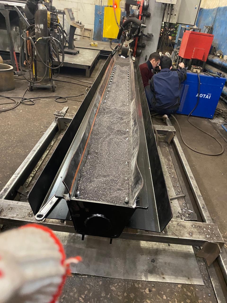 Флюсовая подушка САВС ТСК представляет собой раму, внутри которой расположено устройство пневматического поджима флюса к изделию, а также защитный резиновый фартук. С помощью независимого узла подъема рама флюсовой подушки подводится к изделию. Каждую сторону рамы продольной флюсовой подушки можно поднимать и опускать независимо от другой стороны для максимально точной настройки положения флюсовой подушки. Флюс засыпается внутрь рамы флюсовой подушки на специальную огнеупорную ткань. С помощью пневмоаппаратуры флюс плотно прижимается к свариваемому изделию. Защитный резиновый фартук предотвращает просыпание флюса. Продольная флюсовая подушка применяется при сварке V-образных и Х-образных разделок.