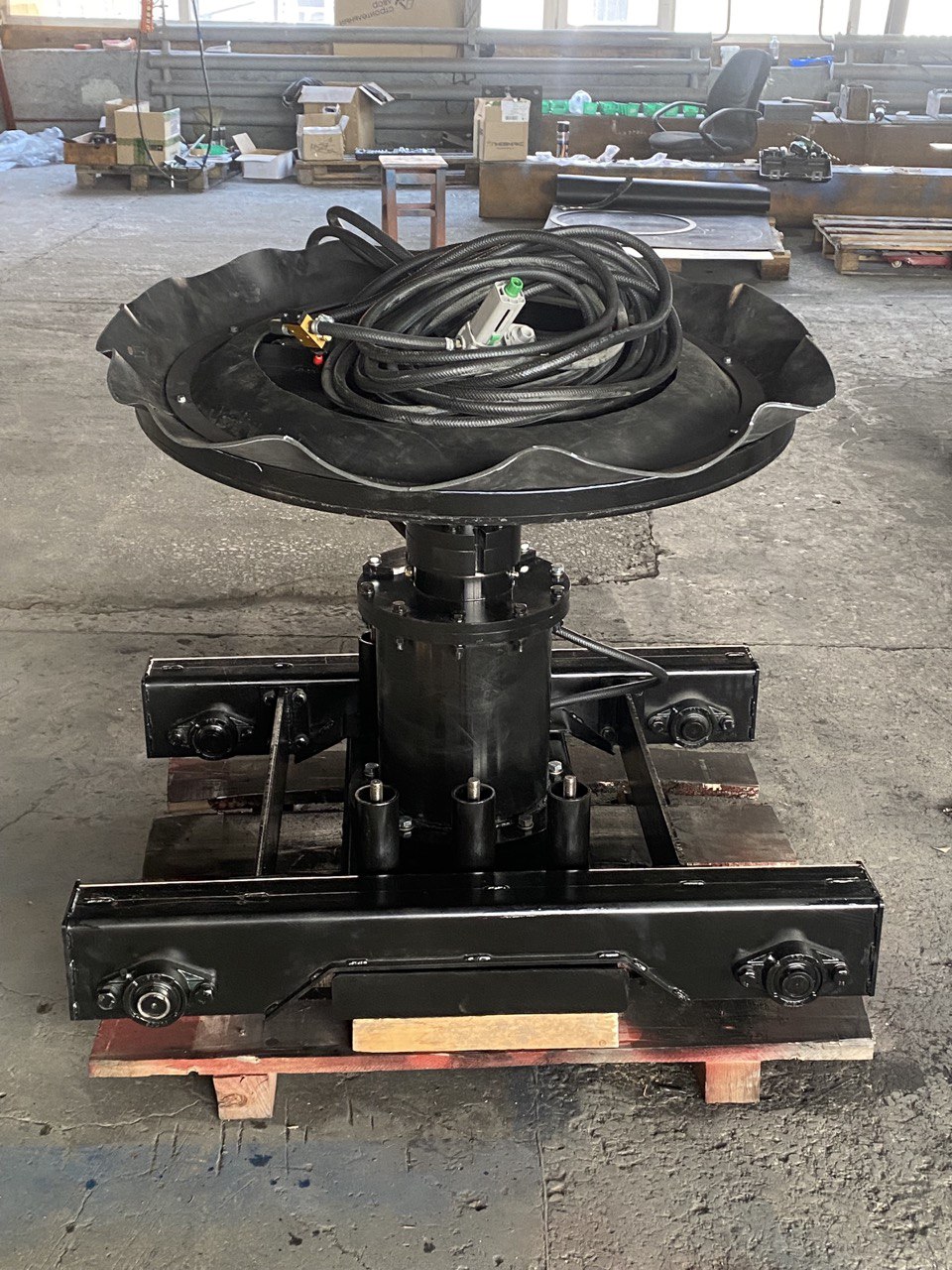 Флюсовая подушка конструктивно представляет собой диск (флюсовая чашка), установленный на наклонной поворотной оси ( угол наклона 5 градусов) . Наклонная ось закреплена на пневмоцилиндре, который установлен на основание с пружинной подвеской относительно передвижной тележки.