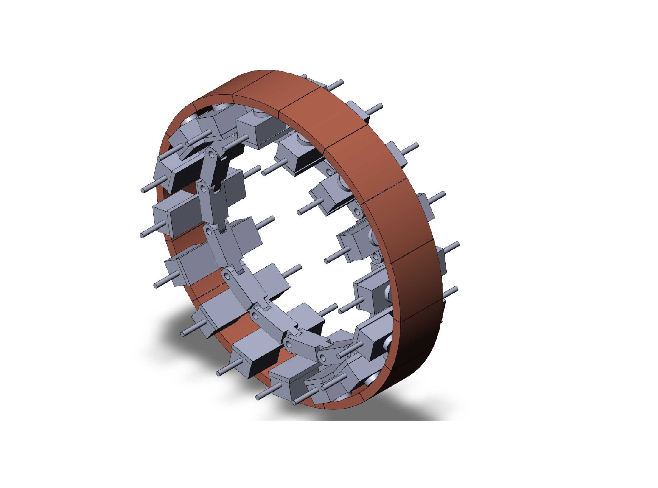 Состав кольца: основу кольца составляет гибкая цепь с быстродействующим разъединителем. На рабочих звеньях кольца установлено 2 ряда компактных гидроцилиндров для последовательной работы внутренней и наружной части. Гидроцилиндры связаны с медными подвижными секторами, которые создают основу формирующего бандажа. Медный бандаж имеет внутреннее охлаждение.